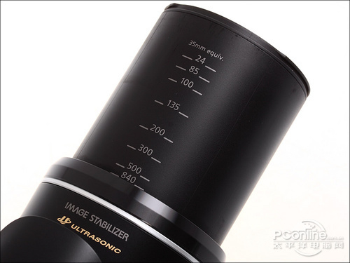 为了便于用户了解镜头当前等效焦距,佳能SX30 IS在镜头上印有对应的等效焦距数值,不过从广角端的24mm,一下子就跳到85mm,中间常用的一些焦段就没有显示了(这是因为从广角端开始变焦时,镜头会先回缩一段,然后再往外伸出,所以像35mm、50mm这些焦段其实是在24mm外面的,为免混淆所以没有标示)。