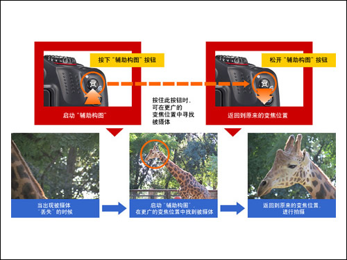 拍摄前,在拍摄菜单中选择“大”、“中”、“小”显示区域,拍摄时,按下缩放构图辅助按钮,先在更广的变焦位置中大致找到被摄体,使被摄体置于画面中白框,松开缩放构图辅助按钮,则返回到原来的变焦位置,帮助拍摄者随心捕捉精彩瞬间。