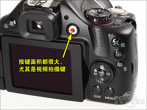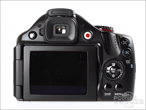 佳能SX30 IS机身背面整体风格仍带有SX双位数系列的特色,可旋转屏幕加上EVF占据了大部分面积。除了十字键外,SX30 IS的其他按键的面积都显得相当大,尤其是那“红点”视频拍摄键,简直就是触目啊!