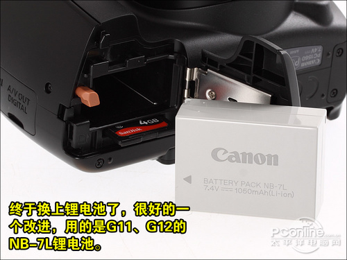 之前的佳能SX10 IS、SX20 IS都是使用4颗AA电池的,以至于拍摄时机身重量比较高(4颗AA电池重量相当可观),而且用户买机之后,还要烦着购买AA充电池的问题(相信没有人会用一次性的碱性电池吧?)。而SX30 IS则转用锂电池了,使用的锂电池型号与G11、G12的相同,续航能力不错。
