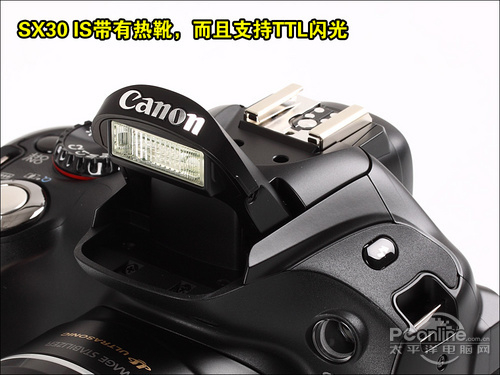 佳能SX30 IS这次重归高端风格,机身顶部设有TTL热靴(带有保护盖),可外接佳能原厂TTL闪光灯,实现更强的闪光拍摄效果。
