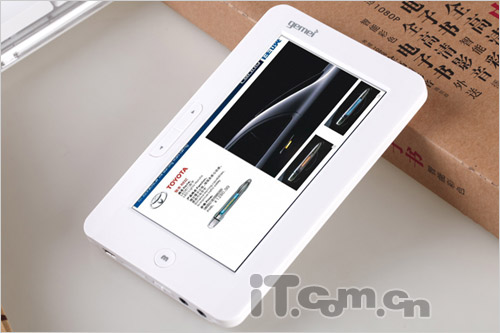 GM5000采用白色机身设计,屏幕为4.7英寸,支持触摸式操控。虽然没有7寸屏那么有观赏性,但是更适合随身携带。歌美喜阅GM5000保留润眼显示技术,改善对比度及亮度曲线,提供8级背光设置和30倍以上的屏幕显示速度,无翻页延迟和黑屏闪烁。阅读功能上,歌美喜阅GM5000支持TXT、HTM、HTML、CHM、PDB、UMD、PDF等多格式文档,对PDF格式兼容性达98%。同时,字体变更、字号/颜色调整、横竖屏切换、书签以及同步朗读功能齐全。