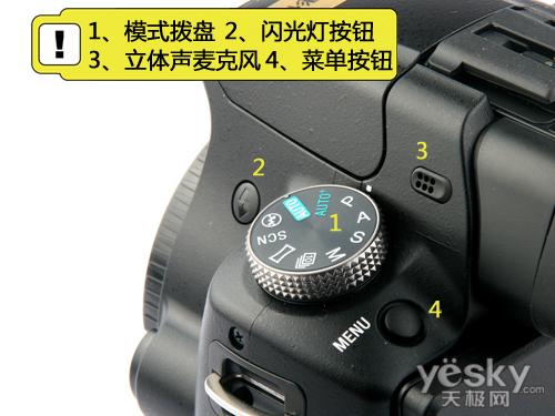 然后来到机身的模式拨盘区域,由于索尼A33的模式拨盘上全新添加了全景扫描以及高级自动模式。在拨盘下则是一个菜单按钮的设计,我们注意到在机身的两侧装备有一对立体声麦克风。