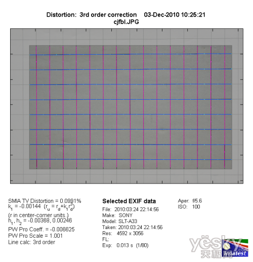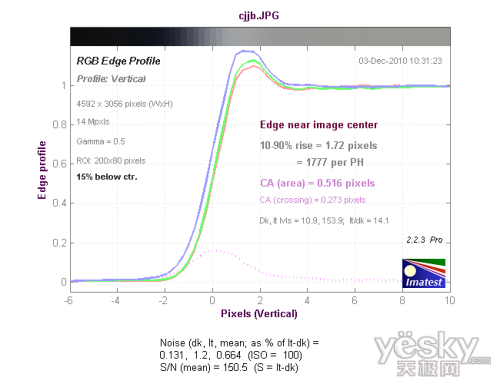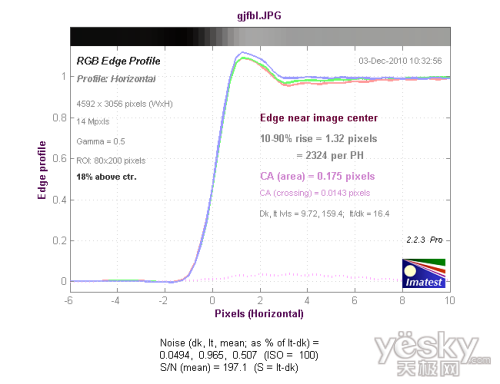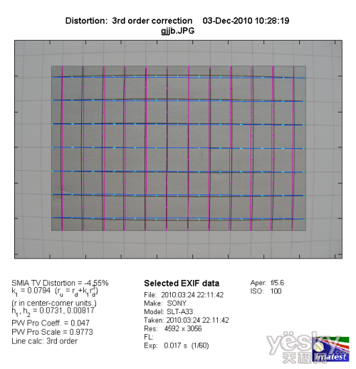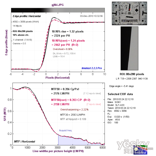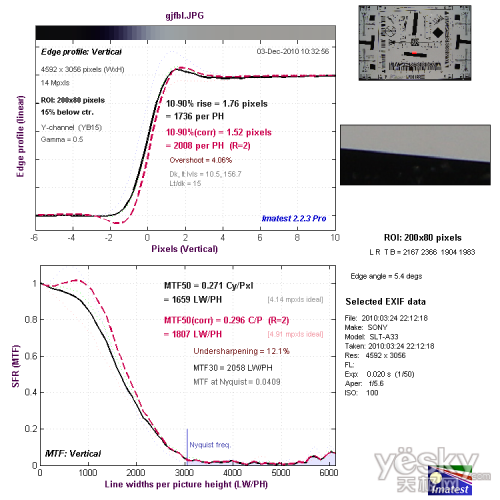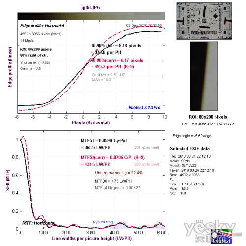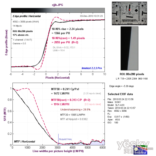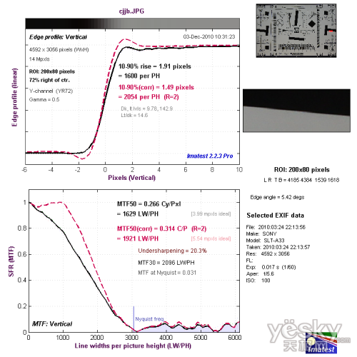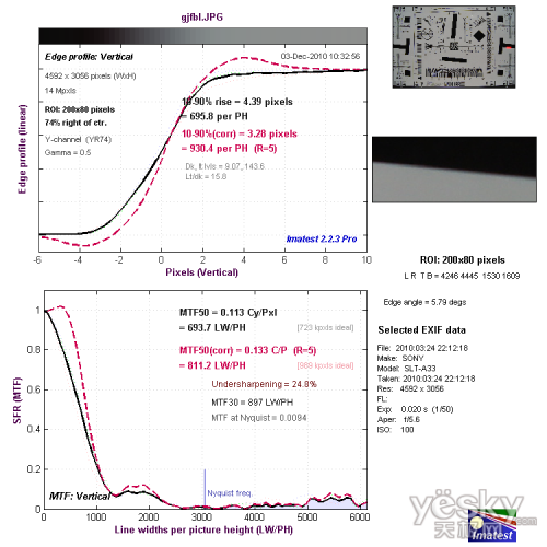 我们使用Imatest对本次评测所使用索尼α33的分辨率与色散情况进行了测试,大家可以将测试所得的分辨率结果与上图标准进行比对,从而获得直观而明确的参考。