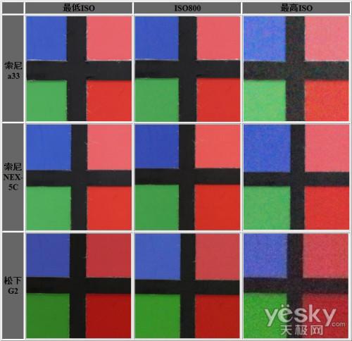 上述为大家展示了索尼α33在各挡ISO情况下的实测结果,可能大家没有办法直观从一个机型中来感知测试结果。下面我们分别选择了索尼NEX-5C和松下G2(资料 报价 图片 论坛)这两款相机还与索尼α55(资料 报价 图片 论坛)进行对比,选出各自最低ISO、最高ISO以及IS0800三档实拍截屏,让大家可以得出一个实质的感受。