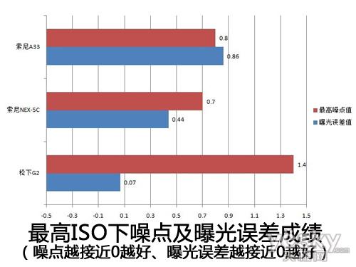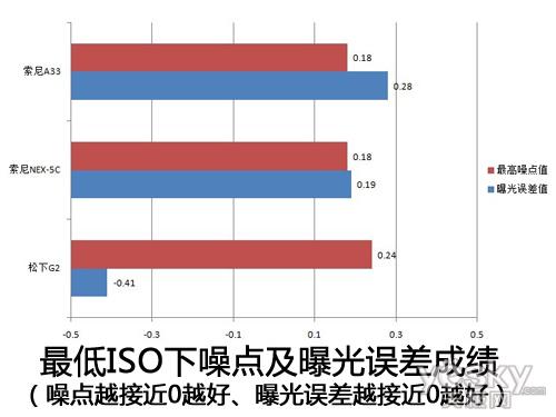 同样我们选择了索尼NEX-5C和松下G2这两款相机还与索尼α33进行对比。在低ISO的情况下,索尼α33的曝光误差为0.28,稍稍过曝。在最高ISO下,曝光误差为0.86,也存在过曝现象。在噪点方面,最低ISO时为0.18,最高ISO时为0.8,可以说Exmor APS HD CMOS影像传感器机身降噪上的贡献是功不可没的。