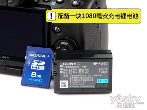 索尼A33配备了一块型号为NP-FW50的1080毫安充电锂电池,续航能力不错,保证了较长的使用时间。同时,此次评测我们使用威刚8GB CLASS10 SDHC为存储介质。