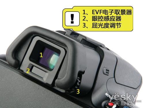 首先还是顶部,由于取消了五棱镜的设计。取而代之的则是一块拥有144万有效像素的EVF电子取景器。在取景器下方依然是眼控感应器,在侧面则是一个屈光度调节旋钮。