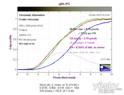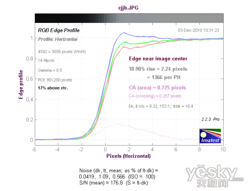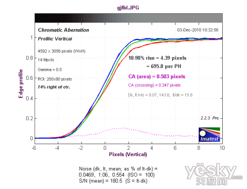 我们使用Imatest对本次评测所使用的索尼α33的分辨率与色散情况进行了测试,大家可以将测试所得的分辨率结果与上图标准进行比对,从而获得直观而明确的参考。