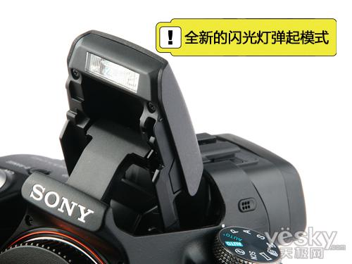 我们还注意到一个小细节,由于没有了五棱镜的束缚,索尼A33的闪光灯的弹起方式也变成了前推式。
