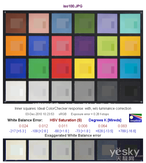 白平衡偏移方面,曝光值误差在0.28,白平衡基本没有偏移。白平衡方面,色温5500K的光照环境下,ISO 100时的偏移非常好,最高处为0.083,色温偏移数值为+789,白平衡偏暖。
