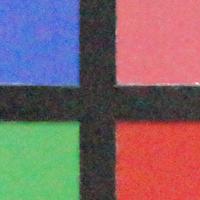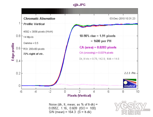 从广角端中心垂直方向色散测试结果来看,色散区域为1.07像素,蓝色通道的色散高于其他三个通道。