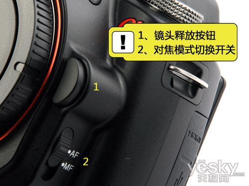 首先看到的是机身前部,在镜头卡口旁边还是依照单反样式设计的镜头释放按钮以及对焦模式切换按钮。