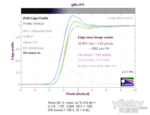从边缘水平分辨率测试的结果看,分辨率达到了431.6LW/PH,达到一般的水平,机内进行了一定的锐化,出现了驼峰现象。