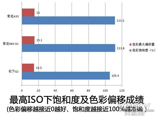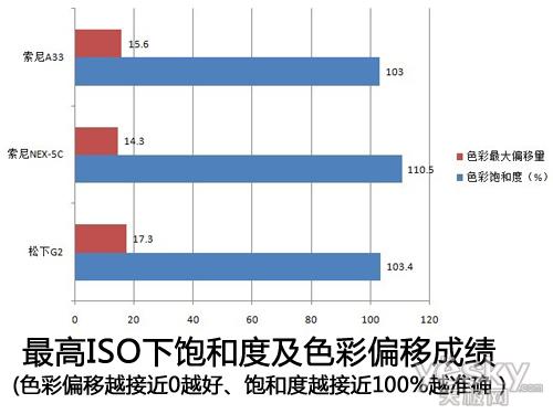 同样我们选择了索尼NEX-5C和松下G2这两款相机还与索尼α33进行对比。色彩饱和度越高那么照片表现出的色彩就越艳丽,而色彩最大偏移则说明了相机的色彩趋向,当然偏移量越小就说明照片的色彩越准确。我们发现索尼α33不管是色彩偏移还是在色彩饱和度方面都表现的非常完美,这样拍摄出来的照片可以更好的还原拍摄时的景象。