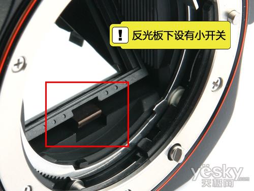 我们注意到,在固定的半透明反光板下,有一个小开关。轻轻按动这个开关,这块半透明的反光板就会弹起,便于我们清洁CMOS。