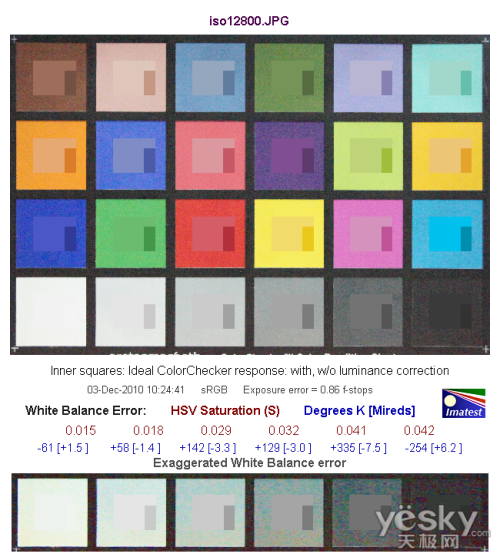 从ISO 12800时的色彩偏移的情况看,索尼α55的色彩饱和度为103%,最大偏移量为15.6。与ISO 12800时的色彩偏移基本一致,红色区域的色彩偏移仍然是相对较大的。