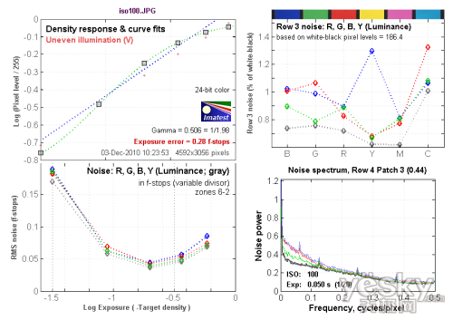 ISO 100的最高躁点值为0.2左右,属正常情况。从Row 3 noise:R,G,B,Y (Luminance)图表中可以看到,在蓝色上是以蓝色通道的噪点为最多,达到1.1左右。 红色上是以蓝色通道的噪点为最多,达到0.5左右。绿色通道的噪点最高值出现在红色 上,达到1.1左右