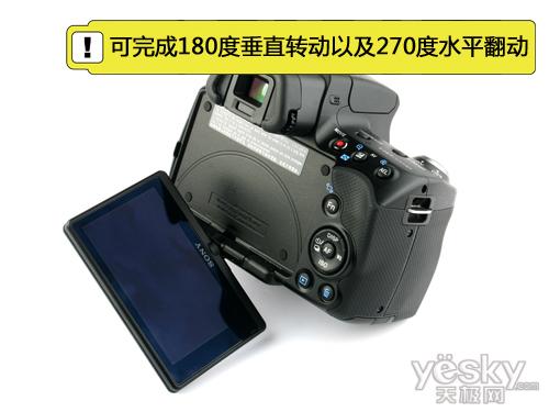 我们发现,索尼A33摒弃了之前的折叠液晶屏。而是采用了全新的多角度可折叠液晶屏。这块屏幕可以提供我们180度的垂直旋转和270度的水平旋转,这让我们拍照起来更加轻松容易。