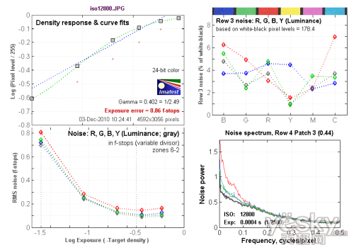 ISO 12800的最高躁点值为0.8左右,噪点控制的相当的好。从Row 3 noise:R,G,B,Y(Luminance)图表中可以看到,在蓝色上是以红色通道的噪点为最多,达到6.1左右。红色上是以绿色通道的噪点为最多,达到4.9左右。绿色通道的噪点最高值出现在红色上,达到5.0左右。