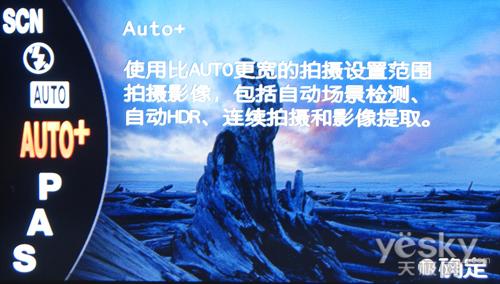首先在转动模式转盘的时候,我们发现新增了索尼TX9(资料 报价 图片 论坛)C、WX5上广受好评的AUTO+模式以及通过全透明反光板所达成的每秒7张的高速连拍模式。并且图形菜单充满了整个屏幕,给我们更直观的体验。