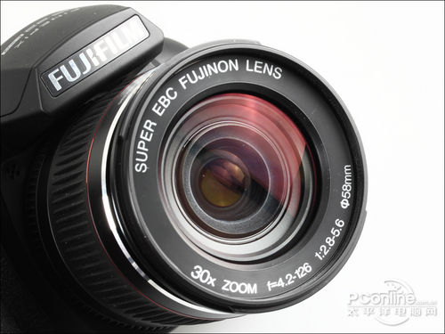 富士HS22 EXR的镜头是富士30倍光学变焦镜头的进化版,这枚镜头加入了超低色散(ED)镜片,能够有效的减少色差和色散,而镜头焦段不变,继续涵盖24-720mm(等效135mm)。镜头镶有一圈红边以表示镜头的质数有别于普通产品,这与佳能的L级镜头不谋而合。HS22镜头操作设计不变,变焦没有使用马达变焦,采用类似单反镜头的手动变焦,变焦的阻尼感不强,非常适中,而且变焦全程的阻尼非常均匀,比一般的入门单反镜头更为顺畅。这枚镜头不仅有变焦环,在变焦环后更有一个对焦环,转动感也是十分顺畅的,但对焦环为电子对焦,不是一般单反镜头的机械对焦机构。