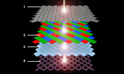 EXR CMOS传感器的结构:1.微透镜 2.色彩滤镜 3.光电二极管 4.高速传输电路