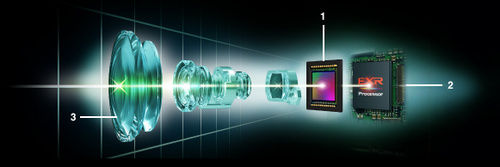 EXR 影像系统的构成:1.EXR CMOS传感器、2.EXR处理器、3.富士龙镜头