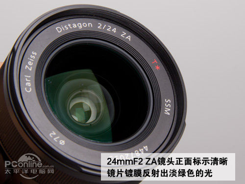 索尼24mmF2 ZA的滤镜口径为72mm,属于比较大的一个了(与索尼85mm F1.4 ZA一样)。正面印着Carl Zeiss以及其他此镜头特征的一些标识,另外还有一组唯一的序列号表明ZA镜头的珍贵。镜头上的镀膜反射出幽幽的淡绿色,莫非这就是传说中“德味”之来由?