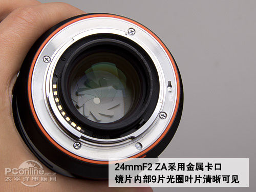 索尼24mmF2 ZA镜头采用金属卡口,做工相当优秀,外圈为索尼α标志性橙色圈圈表明光学巨头现在正在为索尼服务。通过F2的巨大孔径可以看到镜头内的光圈叶片,一共是9扇,可以保证光圈在不同档位都是圆形,令照片的焦外更好看。