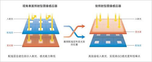 现有表面照射型图像感应器(普通CMOS),配线层在受光面之上,配线层会遮挡住部分入射光,感光能力降低;而背照照型图像感应器,颠倒配线层和受光面的位置,可以高效接收入射光,其感光能力和信噪比大幅提升,因而相机可以实现高ISO感光度和低噪点。