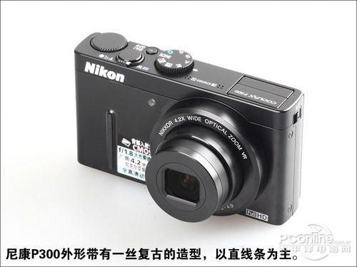 尼康P300的机身前面板由金属制造,而机顶与机身后背则由高强度工程塑料制造。P300的整体设计十分硬朗,方方正正的设计也使人感觉到一丝专业感。P300的机身三围尺寸约103x58.3x32mm (不包括机身突出部分),体积不大,拿在手里感觉十分饱满,同时也十分便携。