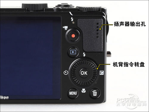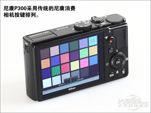 尼康P300的机背按键与尼康P500(资料 报价 图片 论坛)相似,不同之处是P300的五维键同时是一个指令转盘,也是P300的第二转盘,而机顶转盘负责快门速度调节,机背转盘负责光圈的调节。在五维键上方是防滑蒙皮,蒙皮上设有扬声器,正常握持时对扬声器发声有一定的影响。蒙皮旁边则是视频独立按键和回放按键。