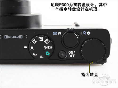 尼康P300的机顶上设有模式转盘、电源开关、快门、变焦拨杆、和指令拨盘。在单手持机时手指刚好能够对电源开关、快门、变焦拨杆、和指令拨盘进行操作,但如果想转换模式就有点勉强了。另外在镜头上设有一个立体声拾音器,能够为视频录制立体声。