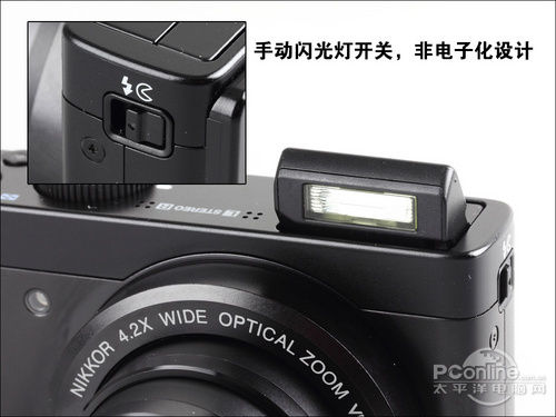 尼康P300的闪光灯采用隐藏式设计,类似与现在比较流行的弹出闪关灯,但P300的闪光灯弹出方式有点与众不同,P300是折叠式弹出。另外这个闪光灯的闪光指数就不是很给力了,只能满足一般使用,不过作为准专业定位,竟然不具备闪光灯热靴,真的有点说不过去。这让人想到了佳能S95,同样不具备热靴,看来两者属于同一级别。