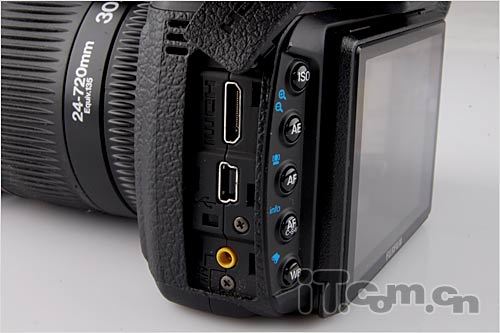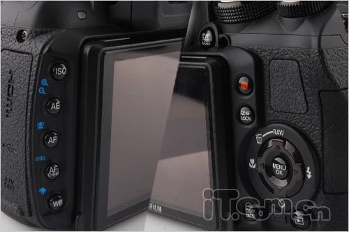 在机背方面,富士HS22EXR的按键可以说是极为丰富。相机机背左侧一栏为相机拍摄设定按钮,其中包括ISO、AE曝光、AF对焦模式、对焦驱动模式和白平衡这5项功能,而在具体设定操作时则需要用户按住功能按键并同时采用十字功能键或是速控转盘进行选择调整。