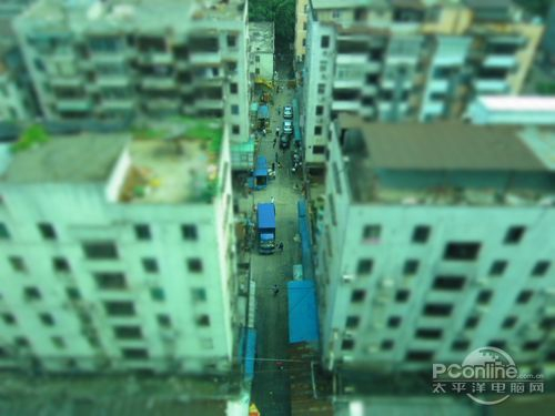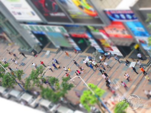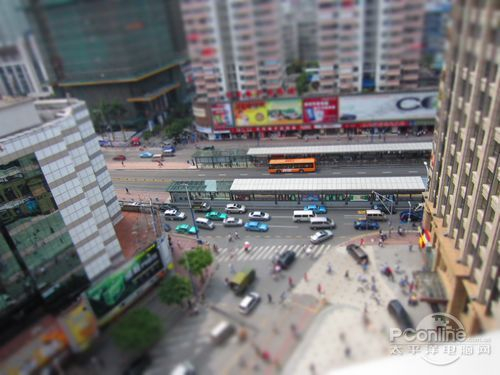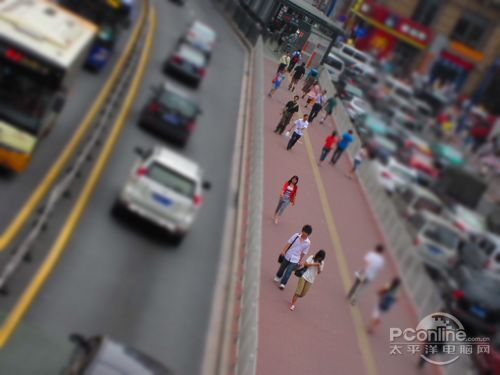 佳能IXUS卡片机所提供的微缩景观功能,其实就是利用芯片实时处理画面,将一部分画面保留清晰对焦的状态,其余部分全部模糊处理,达到景深范围控制的目的。