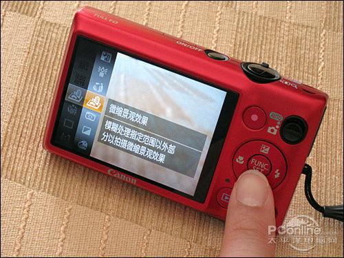 在拍摄状态下,按动FUNC.键,在快捷菜单里面选择“微缩景观效果”拍摄模式,此时相机会自动帮你选择某些项目的设置,例如ISO、色彩效果等等。