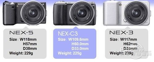 从对比的数据显示,NEX-C3的尺寸相比前作NEX-5更小、更薄、更轻。索尼再一次打破了自己的记录,NEX-C3成为全球最小的APS-C画幅的数码相机。相比NEX-5,NEX-C3显得更为饱满,比NEX-3则多几分线条美。NEX-C3的设计确实看出了索尼对这款产品的重视和期望。