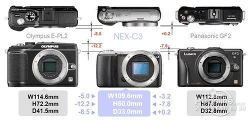 相比奥林巴斯E-PL2和松下的GF2,NEX-C3的体积要小得多,比起E-PL2的高度矮了12.2毫米,比松下GF2也矮7.8毫米。另外,NEX-C3拥有三款色彩,虽然说主打女性市场,但是黑色以及银色也是比较适合男生使用的。