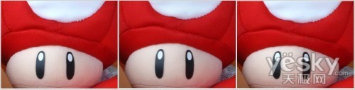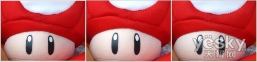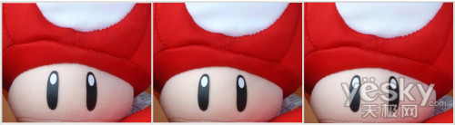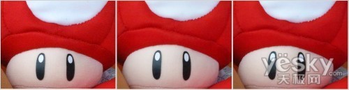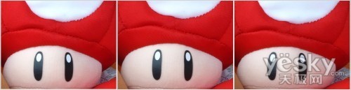 ISO200时看画面细节,马里奥小蘑菇的白色斑点绒毛非常的细节非常细腻、层次非常丰富。眼睛部分的锐度也非常可观。应该说ISO 200和ISO 400的画面没有太大区别,各级降噪设置下的区别也不明显。