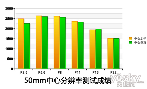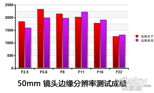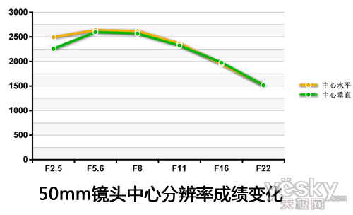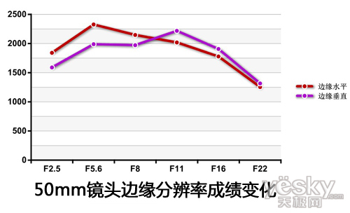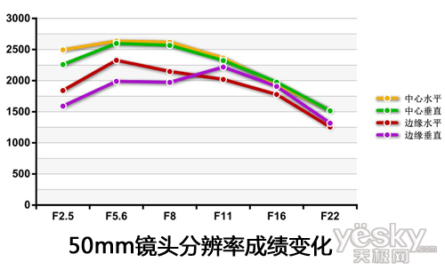 从镜头的中心分辨率测试成绩来看,中心水平以及中心垂直分辨率的峰值均出现在F5.6光圈时,超出2500线。从F5.6开始渐渐缩小光圈,分辨率也随之平稳的下降。可见F5.6为最佳光圈。