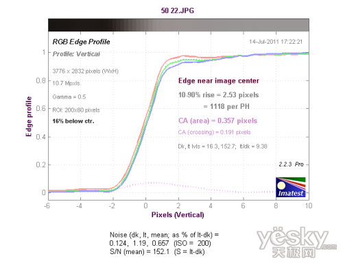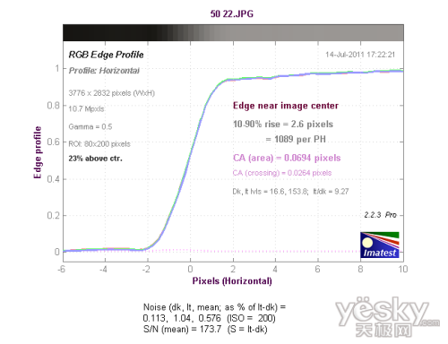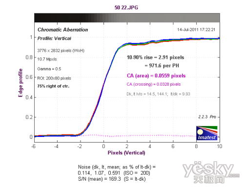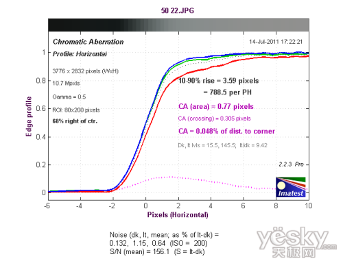 从F22光圈时的镜头边缘水平与垂直方向的色散情况来看,水平方向的色散区域为0.77,垂直方向的色散区域为0.0599色散区域的大小在1个像素左右,一般人的肉眼无法察觉。
