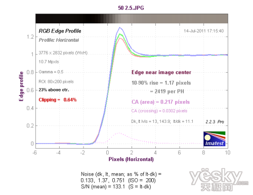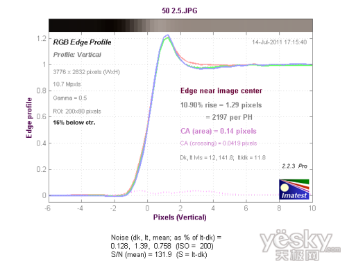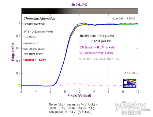 从全开光圈时的镜头中心水平与垂直方向的色散情况来看,水平方向的色散区域为0.217方向的色散区域为0.14,色散区域的大小在1个像素以内,一般人的肉眼无法察觉。