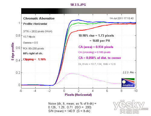 从全开光圈时的镜头边缘水平与垂直方向的色散情况来看,水平方向的色散区域为0.934垂直方向的色散区域为0.074色散区域的大小在1个像素以内,一般人的肉眼无法察觉。