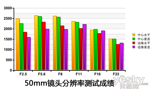 从上面的整体数值我们可以看到,不论是哪个区域,镜头的中心水平分辨率始终保持在一个较高的水平上。在最大光圈F2.5头的分辨率表现的相当出色。我们可以发现,镜头在F8之后的表现就相当的平稳让人满意。