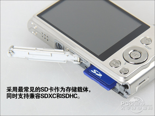 位于机身下方的电池仓和存储卡槽。卡西欧EX-ZS10采用SD卡作为存储载体,同时兼容SDHC和SDXC格式的存储卡。供电方面,卡西欧EX-ZS10使用一块容量为600mAh的NP-120充电式锂电池工作,官方介绍这块电池可以拍摄约190张的静态照片。在实际使用上,经过一天约6、70张照片的拍摄后,电量显示剩余2/3,可见相机的续航能力相当不错。