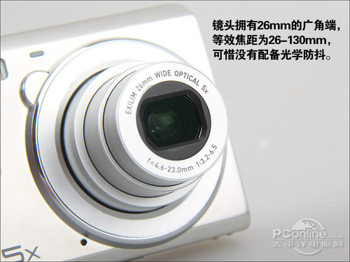 卡西欧EX-ZS10配备的是一枚5倍光学变焦镜头,焦距(相当于35mm照相机)为26-130mm,镜头的最大光圈值为F3.2(广角端)和F6.5(长焦端)。卡西欧EX-ZS10的镜头对焦距离为0.1米至无限远,在微距拍摄能力上表现较弱。由于产品定位的原因,卡西欧EX-ZS10是没有采用镜头光学防抖技术的。