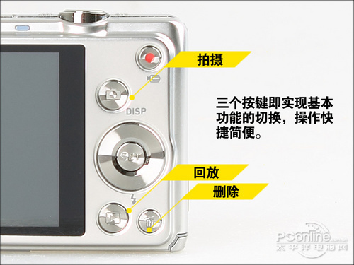 背部控制面板上,特意设计的“拍摄”、“回放”和“删除”三个基本功能按钮,让使用者可以简单明了地操作相机。毕竟对于入门使用者来说,越简洁的设计可以让他们更轻易上手使用进行拍照。