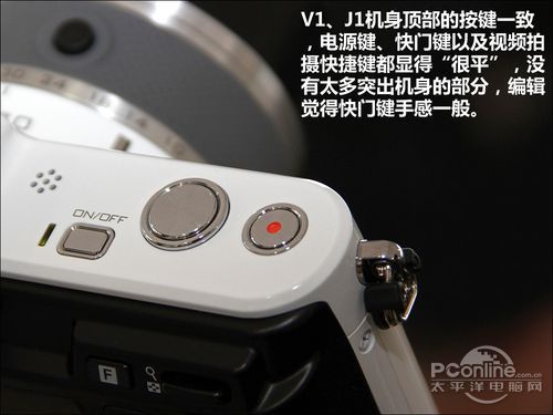 这是尼康V1的机身顶部按键(其实J1也一样),可以看到按键的设计还是偏向于入门、时尚化的,显得相当简洁。专门独立出来的视频拍摄键让视频拍摄变得更加方便。